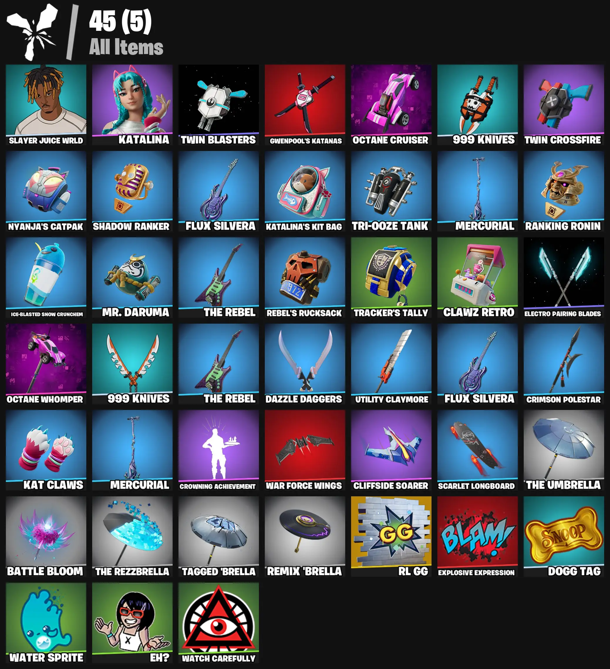 [PC/PSN/XBOX] 2 skins | Slayer Juice WRLD | Katalina | Twin Blasters | Gwenpool's Katanas | Octane Cruiser | 999 Knives | Twin Crossfire | 400 VB