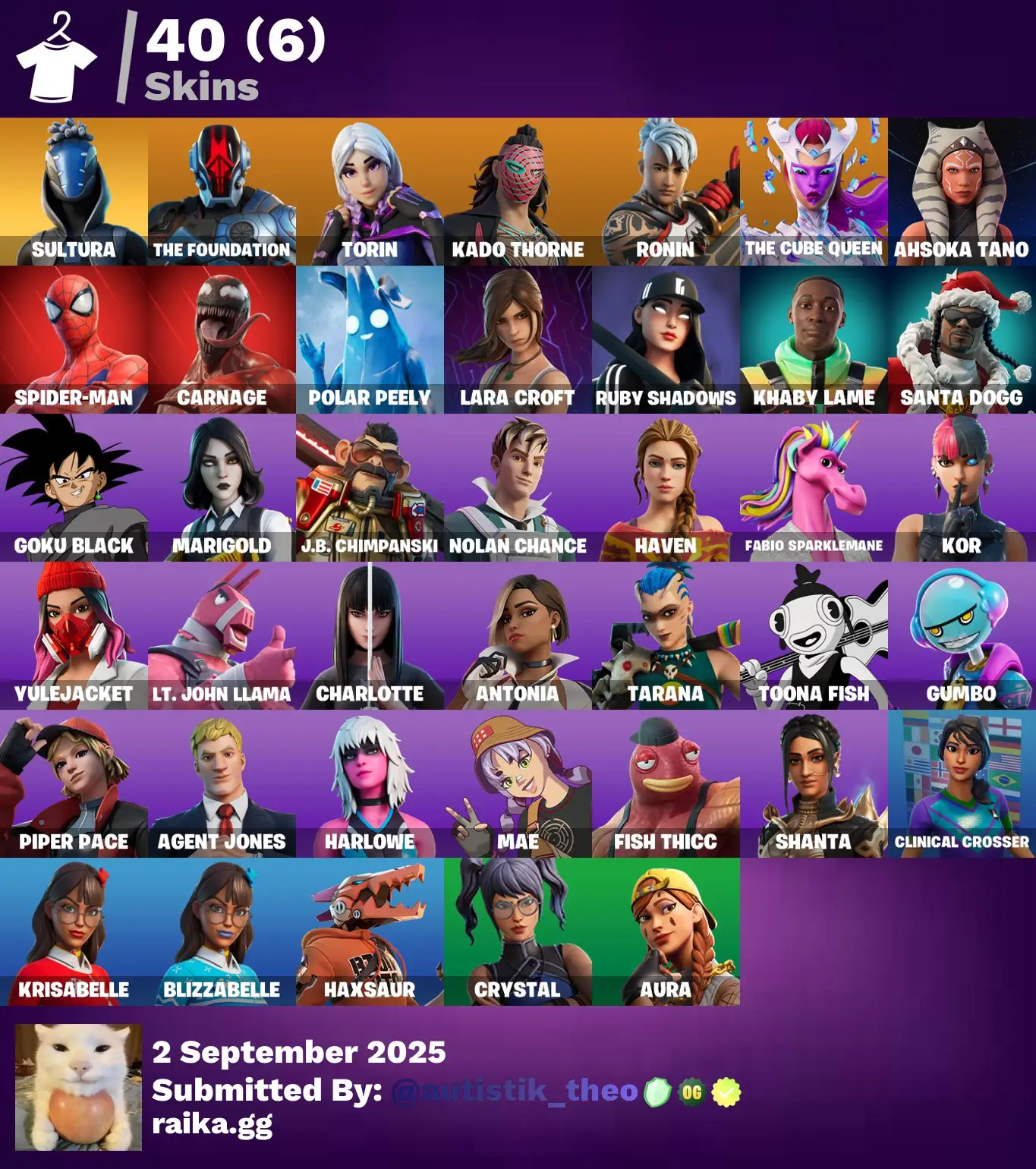 [PC/PSN/XBOX] 40 skins | Sultura | The Foundation | Torin | Kado Thorne | Ronin | The Cube Queen | Ahsoka Tano | Spider-Man | Carnage | Polar Peely | 250 VB